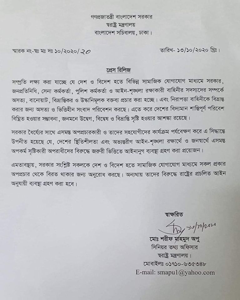 এতে বলা হয়, নিরাপত্তা বাহিনীকে বিভ্রান্ত করার জন্য অসত্য ও ভিত্তিহীন সংবাদ পরিবেশন করছে। এতে করে দেশের বিদ্যমান শান্তিপূর্ণ পরিবেশ বিঘ্নিত হওয়ার সম্ভাবনা, জনমনে উদ্বেগ, বিদ্বেষ ও বিভ্রান্তি সৃষ্টি হওয়ার আশঙ্কা রয়েছে।